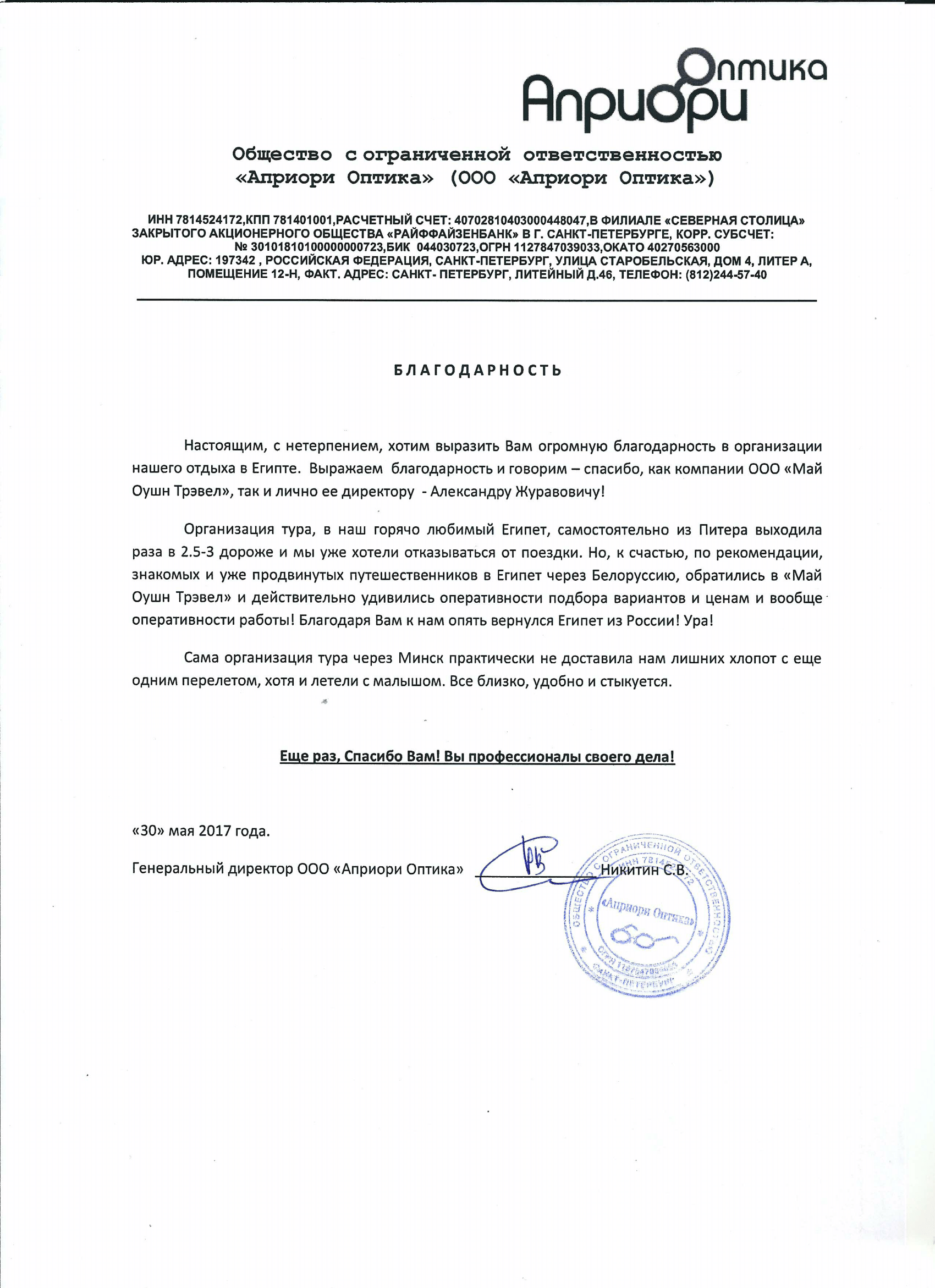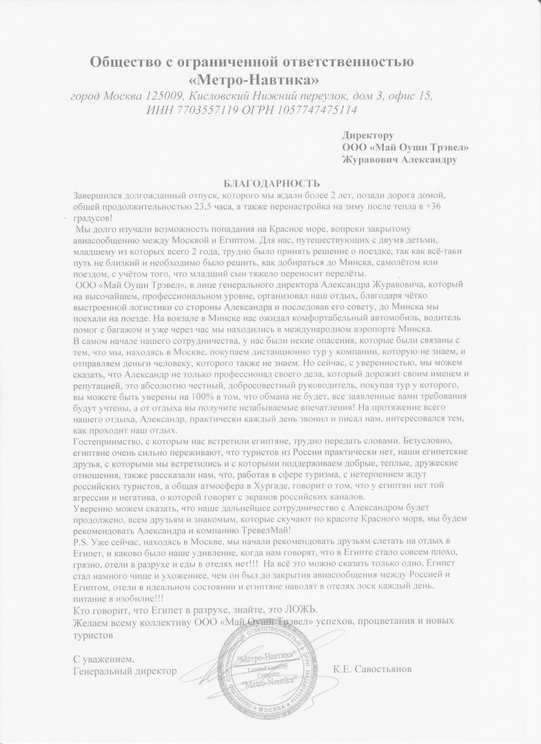 Самым болезненным является вопрос перевода оплаты,особенно, в другую страну. Но, друзья, по-другому, к сожалению, никак - такова ситуация у нас с Вами. Тут либо доверяете, либо - нет. 1) Заключаем Договор и присылаем выписку Вашего поступления на Р/С.Также операционисты банков часто говорят, что оплата идет около 5 дней. На самом деле, иногда оплату мы видим спустя несколько часов. По запросу, можем предоставить "скрин" поступления Вашего перевода. 2) Забронированную заявку можете проверить и отслеживать на сайте туроператора. 3) VIP статус некоторых операторов, например ТезТур 3) Наш опыт при отправке россиян в Египет - ЧЕСТНО подскажем все подводные камни 4) Наши отзывы и рекомендации туристов из России, отдохнувших на Красном море от ТрэвелМай. Пожалуйста, переходите с сайта в нашу группу в контакте и можете свободно с кем-то пообщаться - думаю, не откажут.